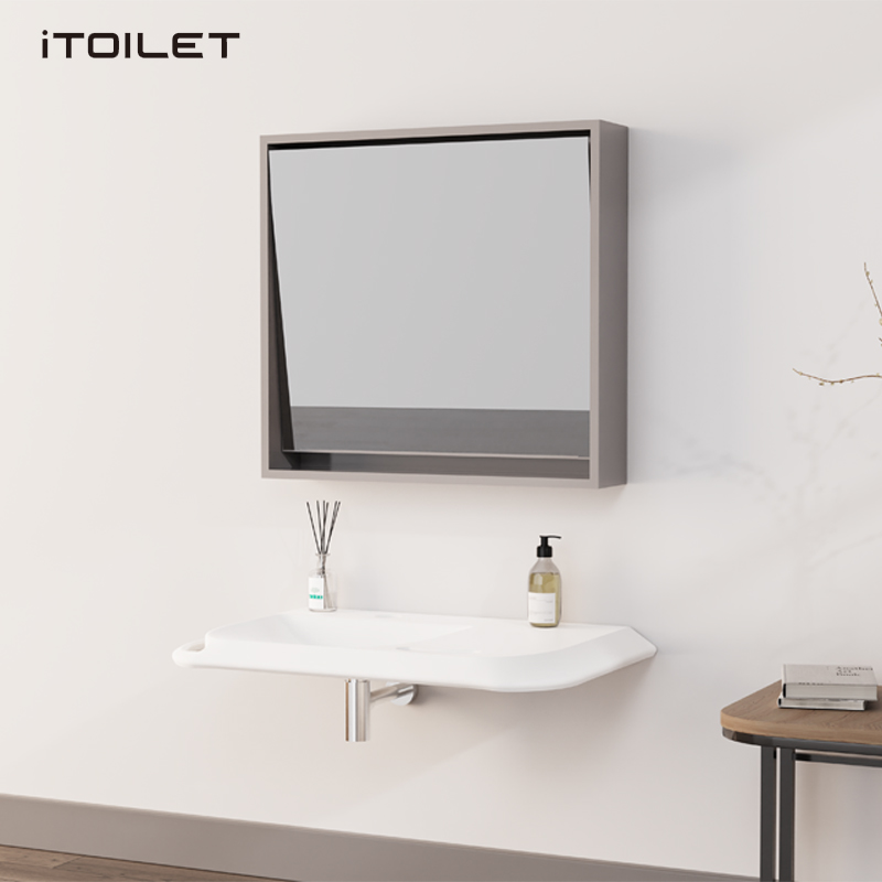 坐輪椅與站立時角度不同,鏡面傾斜,坐在輪椅上洗手時,也能正常照鏡子,整理儀容。
